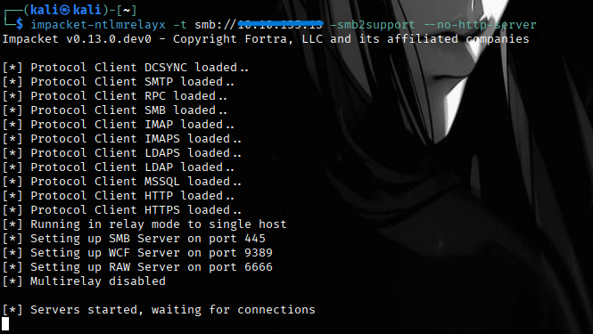 Rerun the ntlmrelayx, but this time with -smb2support and -i flag (-i flag will open an interactive shell for accessing the SMB server).